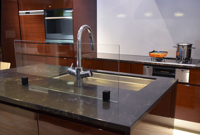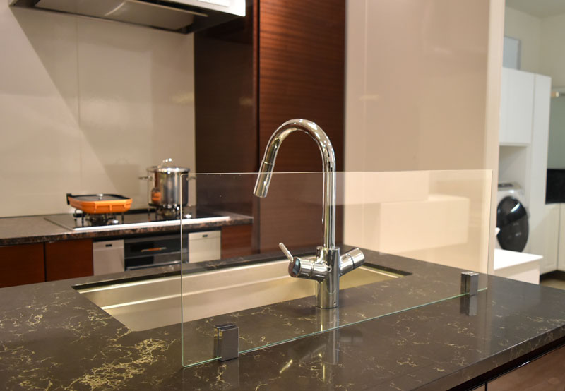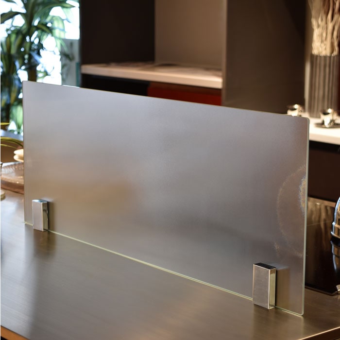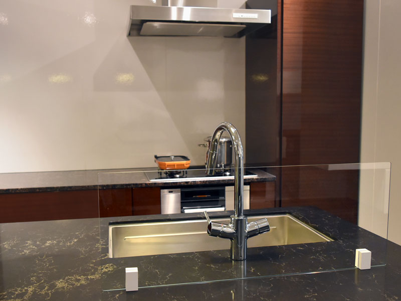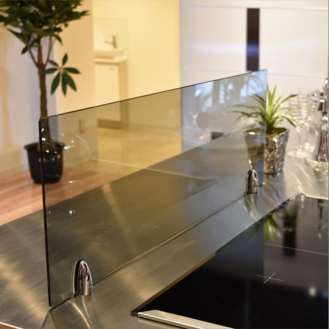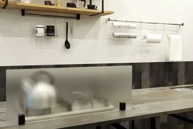 コンロ前、シンク前のスクリーン(デバイダー)として水はね、油はねを防ぎます。ブラケット金物だけのご提供も可能です。面取りガラスや人造石、セラミック、ステンレスなど厚さ8mmまでのスクリーン用パネル材をセットしてさまざまなデザインスクリーンをお楽しみいただけます。