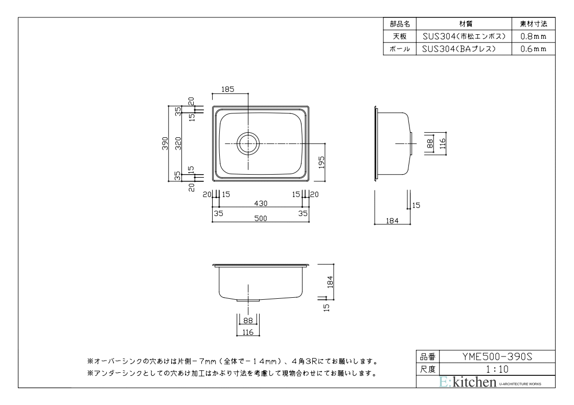オーバーカウンターシンク 1槽シンク トップ市松エンボス仕様