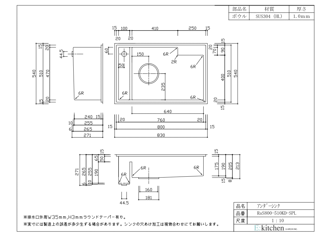 深さ:SUS304でのプレスシンクの深さは約190mm。プレス設備でしぼれる限界寸法です。RASシリーズは収納機能を考慮してH寸法を205mmと深めに設定しました。静音:ブチルゴム6mm厚と0.1mmアルミ箔のサイレントシートをオプション設定。(側面部は厚2mm+0.05mmステンレス箔)