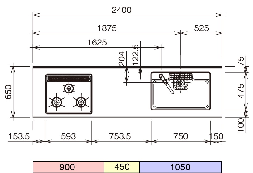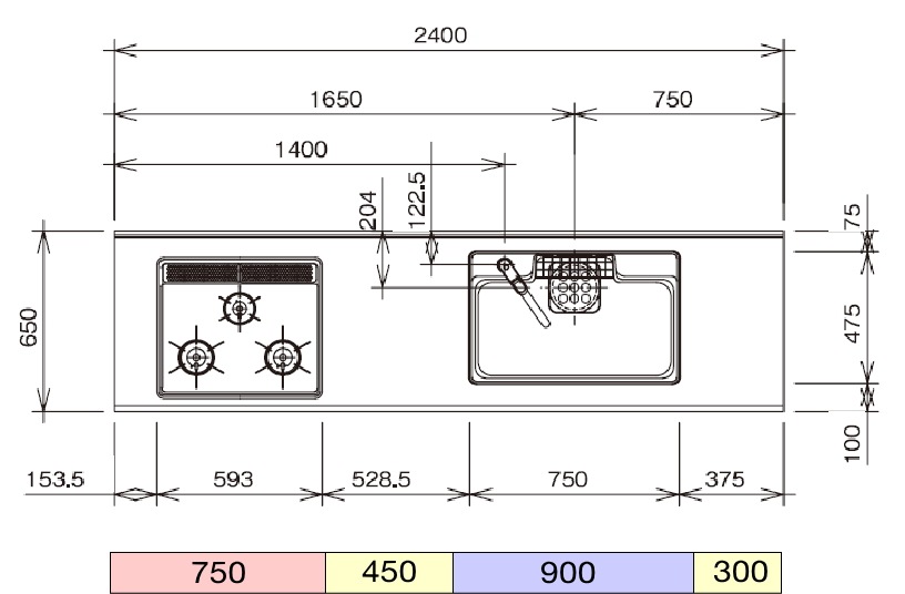 画像の寸法図に表示されているベースキャビネット「コンロキャビネット・調理キャビネット(食洗機スペース)・シンクキャビネットなど」のご参考想定レイアウトです。お客様のご希望に合せて適宜調整いただけます。